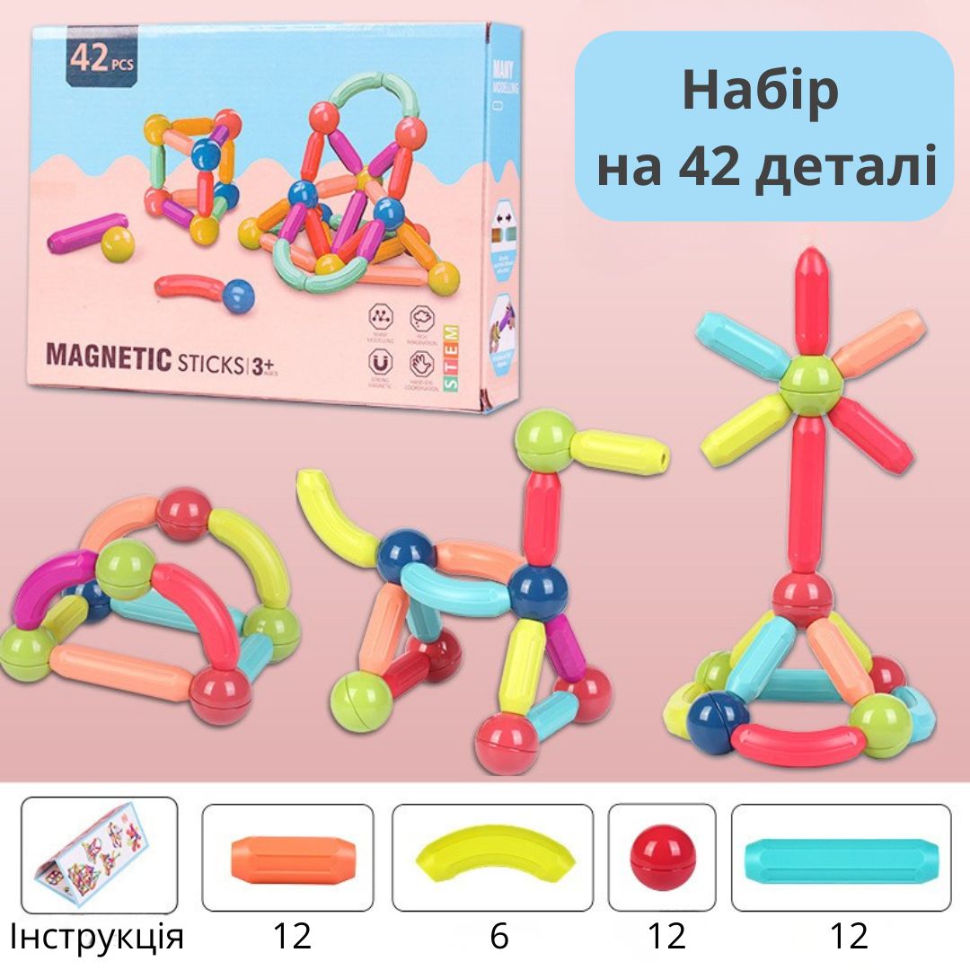 Елементи легко та надійно з’єднуються між собою завдяки магнітам — конструкції тримаються міцно і не розпадаються під час гри.