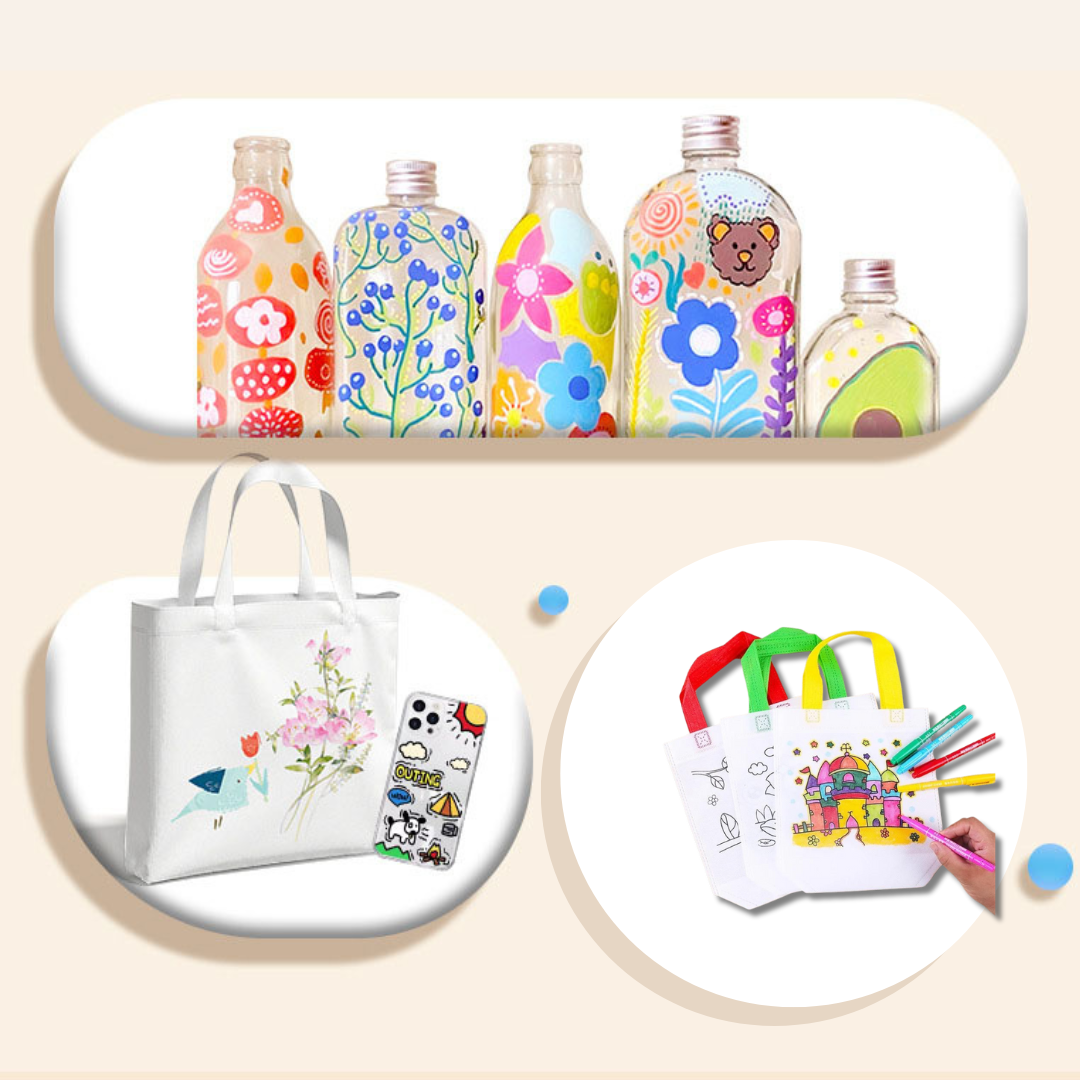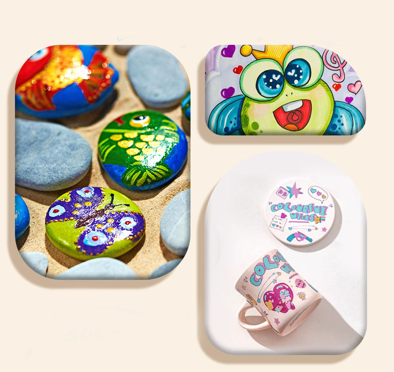 Малюють практично на будь-якому матеріалі: папері, картоні, дереві, камені, кераміці, склі, металі, пластику, тканині. Це робить їх ідеальними для різних видів творчості, від дитячих малюнків до професійного декору.