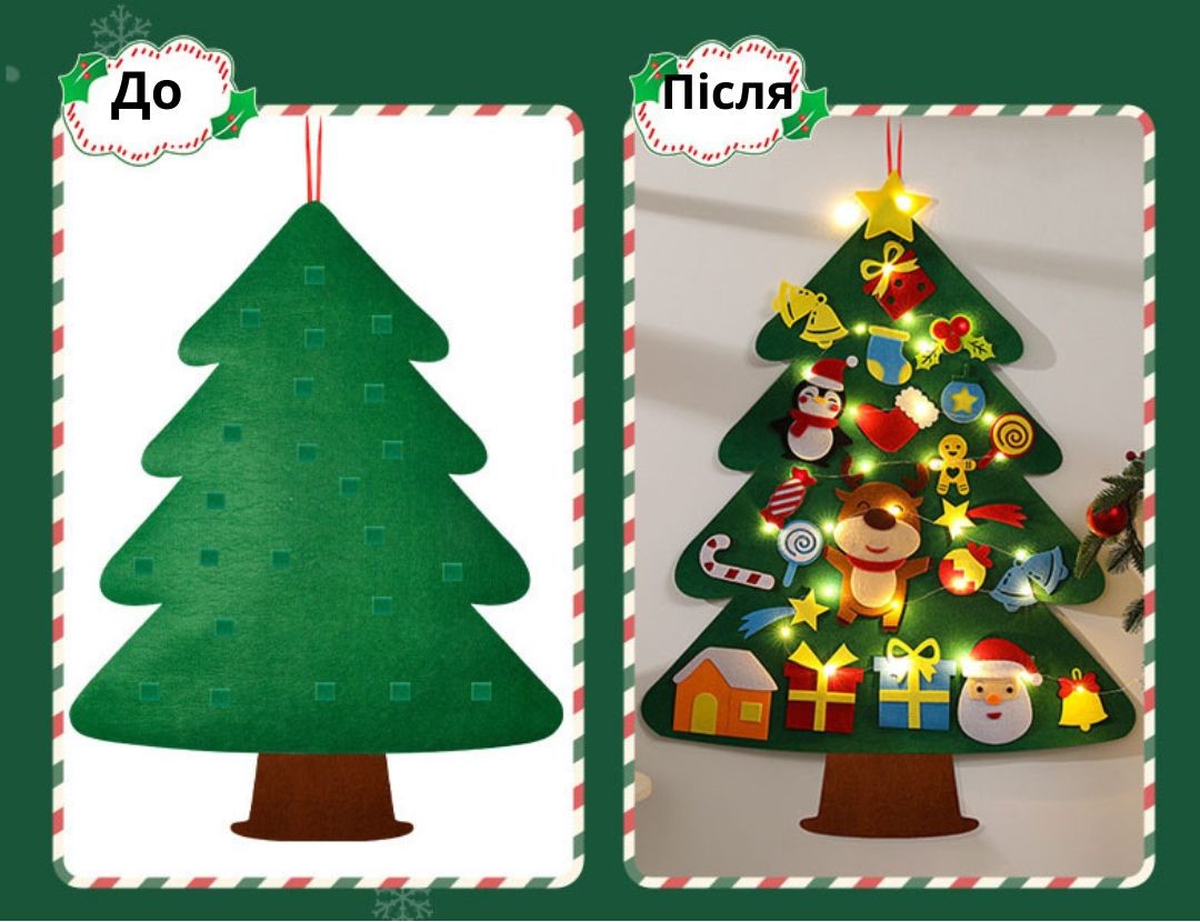 М’який фетр, відсутність гострих елементів — ялинка підходить навіть для найменших дітей.