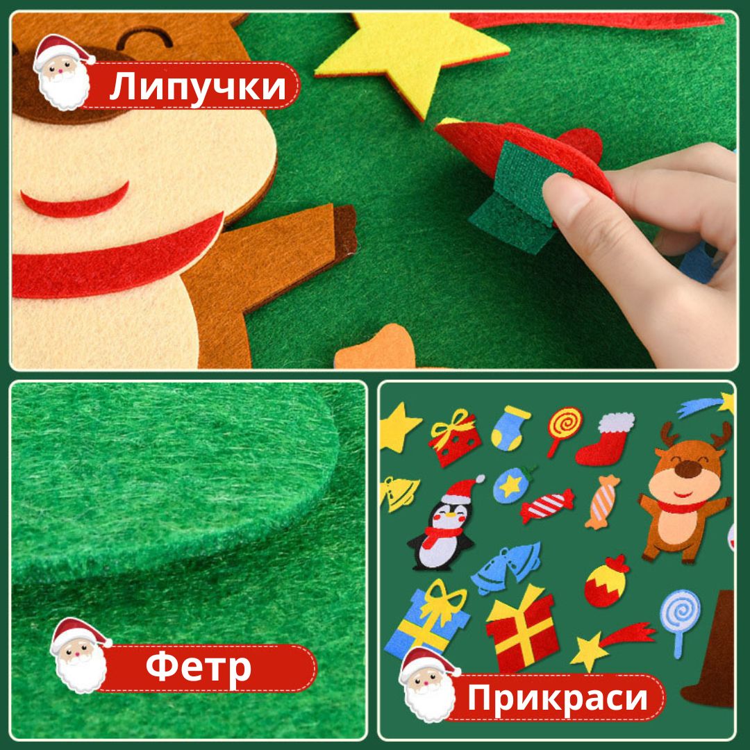 Іграшки-прикраси кріпляться на липучки, їх можна переставляти безліч разів — це тренує дрібну моторику, логіку, творче мислення та розвиває фантазію.
